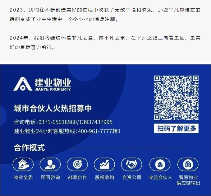 這一年,我們以各條線大比武淬煉一線服務技能、以系列專項行動持續(xù)提升物業(yè)服務品質、以多樣的幸福時光里活動豐富業(yè)主生活、以強大的綜合實力贏得多項榮譽……這一年,建業(yè)物業(yè)人在平凡的崗位上,不斷創(chuàng)造美好,以更好的面貌來迎接建業(yè)物業(yè)的第30年。
