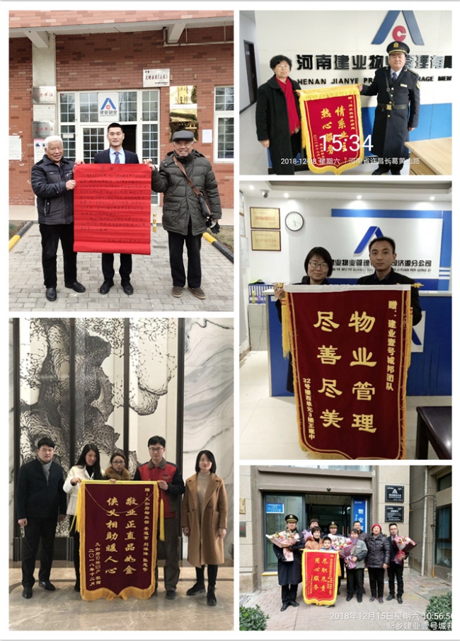 寒風(fēng)刺骨、呵氣如霜的12月,建業(yè)物業(yè)人一如既往地堅(jiān)守在各個崗位上,從點(diǎn)滴之處關(guān)心幫助業(yè)主,為業(yè)主帶來暖心服務(wù)。2018年12月,全省各地共涌現(xiàn)出拾金不昧、技術(shù)高超、服務(wù)熱情、助人為樂等好人好事共222例,其中,收到錦旗78面、感謝信114封、致電感謝32起。