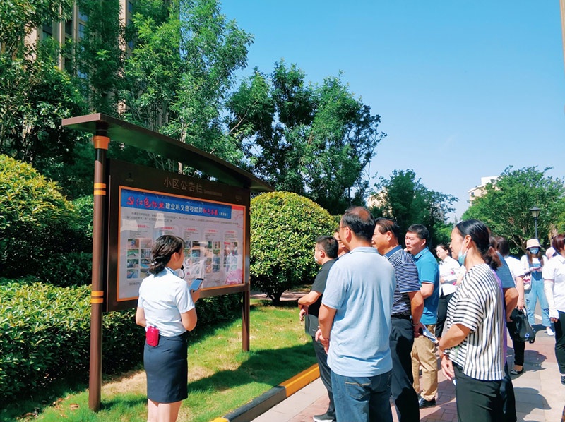 考察組一行先后參觀了鞏義·建業(yè)壹號(hào)城邦黨建墻、企業(yè)文化墻、紅色活動(dòng)公示欄,并在項(xiàng)目大廳做溝通交流。鞏義·建業(yè)壹號(hào)城邦物業(yè)黨支部充分發(fā)揮黨建引領(lǐng)基層社會(huì)制理作用,積極探索推進(jìn)社區(qū)與物業(yè)管理工作的有機(jī)融合,著力打造“紅色物業(yè)”,推動(dòng)社區(qū)共建、共治、共享,考察組對(duì)其社區(qū)治理格局表示高度認(rèn)可。