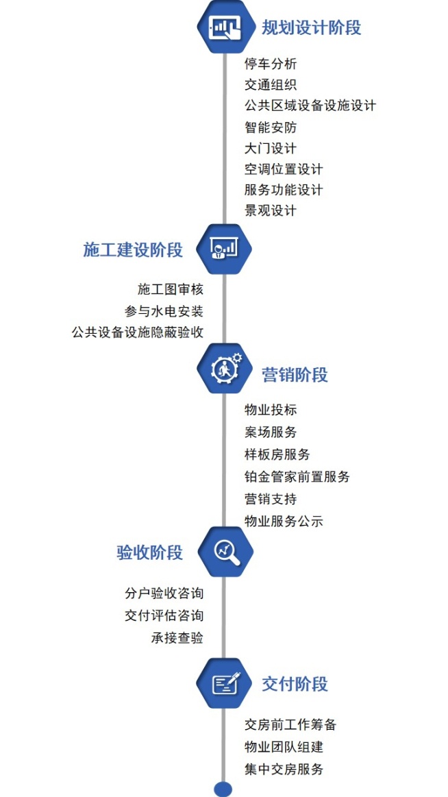 隨著房地產(chǎn)市場(chǎng)的日趨成熟,業(yè)主對(duì)房屋設(shè)計(jì)與物業(yè)管理的品質(zhì)提出了更高的要求。建業(yè)物業(yè)前期介入部參與到項(xiàng)目開(kāi)發(fā)的全生命周期,圍繞客戶使用、物業(yè)管理及開(kāi)發(fā)商需求等角度提出合理化建議,力爭(zhēng)將客戶的訴求呈現(xiàn)在設(shè)計(jì)期,將客戶的痛點(diǎn)消滅在交房前,提升客戶對(duì)產(chǎn)品與物業(yè)服務(wù)的滿意度。建業(yè)物業(yè)前期介入服務(wù)分為規(guī)劃設(shè)計(jì)、施工、營(yíng)銷(xiāo)、驗(yàn)收和交付5個(gè)階段,涉及23項(xiàng)重點(diǎn)工作內(nèi)容。