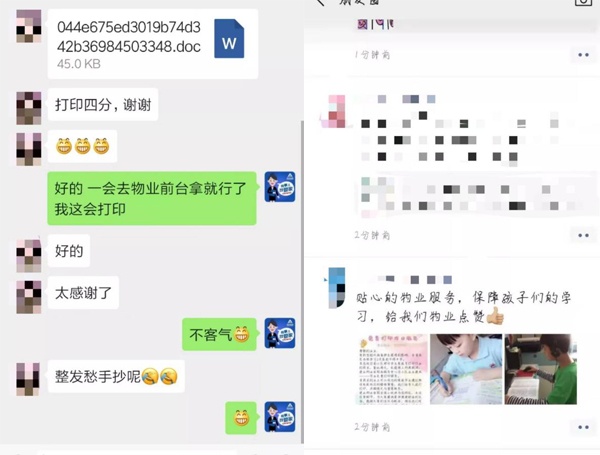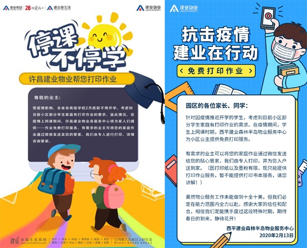 因為疫情影響,新學期開學時間推遲,為了不耽誤孩子的學習,不少學校采取了線上教學的模式。建業(yè)物業(yè)也未停下腳步,免費打印作業(yè)、代買學習用品、寄送學習資料……全力保障業(yè)主孩子在假期的學習質(zhì)量。