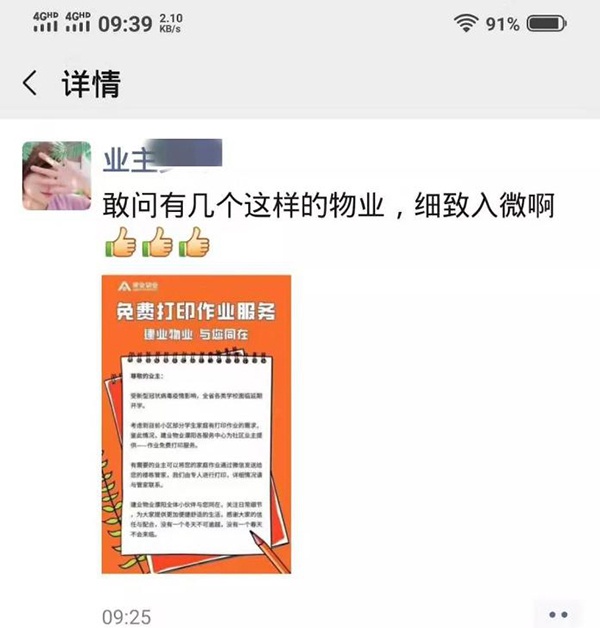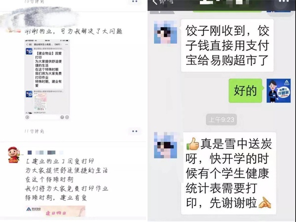 “這項服務就是及時雨,就是雪中送炭!外面打印店都沒開門,建業(yè)物業(yè)真的幫我們解決了一大難題。”