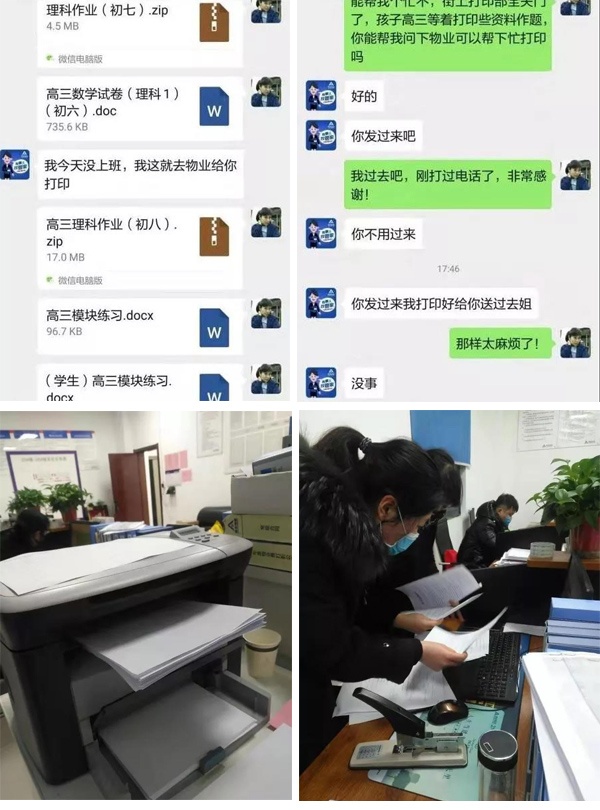 管家何利平知道趙女士的需求與顧慮后,便提出在晚上下班后幫助趙女士打印,就這樣,何利平與另兩位同事一起在下班后的夜晚,打印、分類、整理、裝訂,忙活了幾個小時,終于將三百多張試卷送到了業(yè)主的手中。事后,業(yè)主趙女士表示:住建業(yè),最幸福!疫情時期,我們小區(qū)的服務細致入微,無可挑剔,讓人安心、放心、感動。