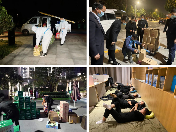 凌晨五點多,在橘黃的路燈下,建業(yè)物業(yè)人已開始布置核酸現(xiàn)場,直到深夜,他們?nèi)栽诖虬诙煲偷奈镔Y。靜默期間吃住在小區(qū)的建業(yè)物業(yè)人,醒來就奔波在園區(qū)里,深夜就席地而睡,他們猶如一簇簇燭火,在黎明到來之前,用微光照亮城市。