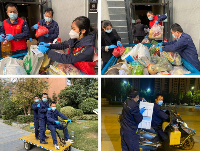 因?yàn)橐咔楣芸兀?1號(hào)樓1單元的122戶業(yè)主被封控在家。他們一戶戶統(tǒng)計(jì)業(yè)主物資需求,統(tǒng)一進(jìn)行購(gòu)買和配送。物資到位后,他們又全員上陣,先按照樓層進(jìn)行分類,再由5名維修工穿著密不透風(fēng)的防護(hù)服,一趟趟地穿梭在小區(qū)里。為了提高效率,三輪車、電動(dòng)車都被利用起來(lái),只為盡早將物資運(yùn)送到業(yè)主手中。