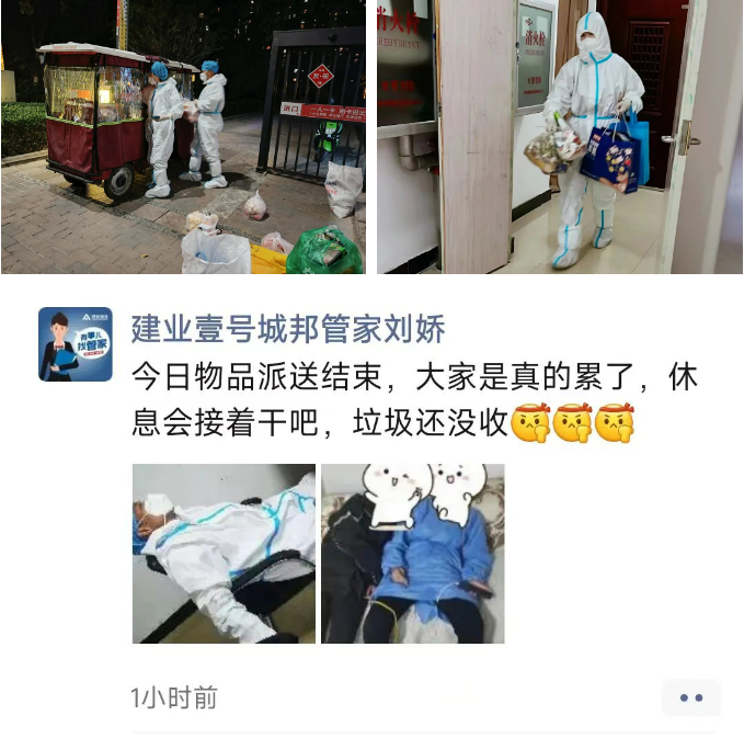 “咱們商量一下分工,趕緊行動(dòng)起來(lái)!”“我們5個(gè)男的重點(diǎn)負(fù)責(zé)封控樓道的清收垃圾、防疫消殺、還有物資派送。”在這次疫情防護(hù)中,5名維修工成為重要主力,承擔(dān)了物資配送等大部分體力勞動(dòng)。
