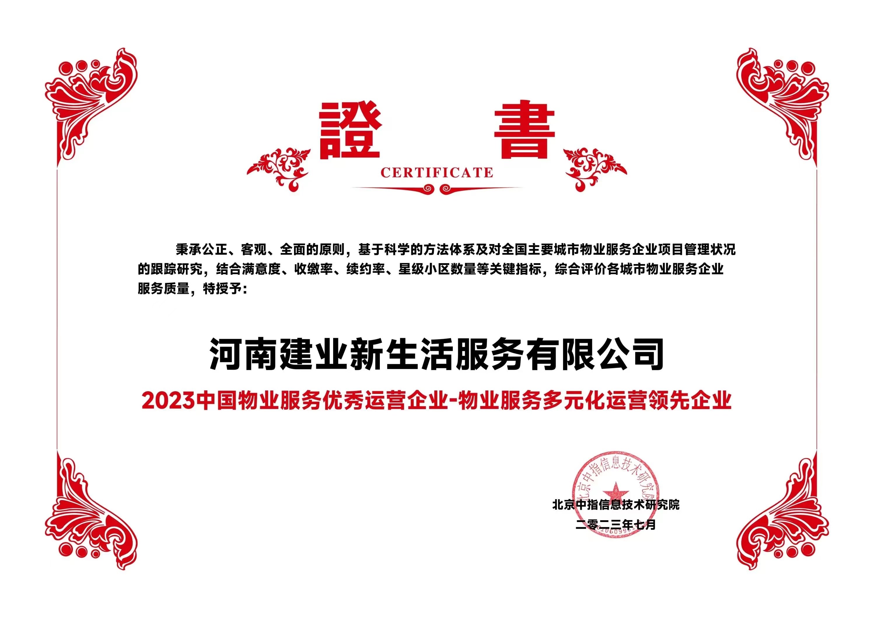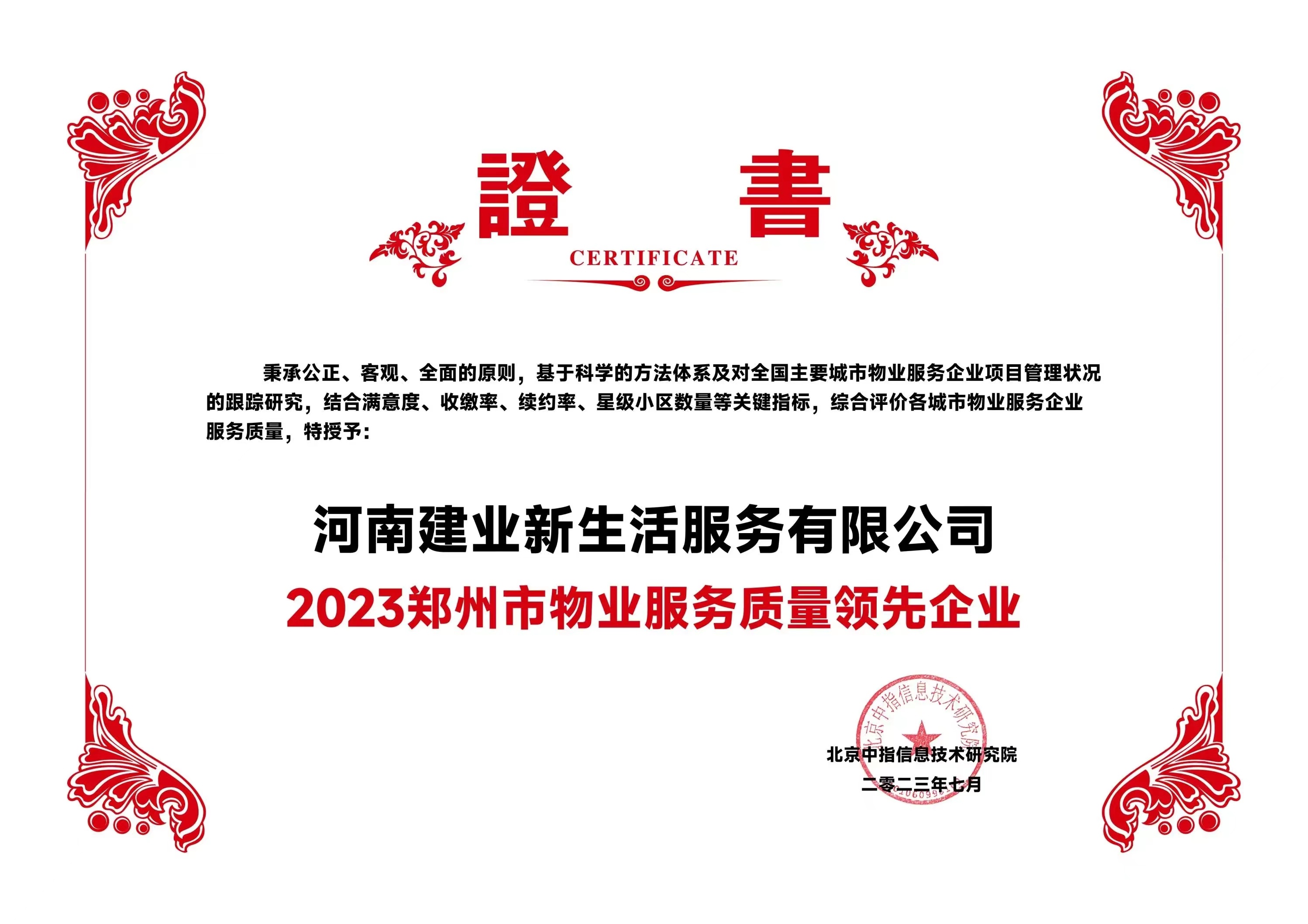 7月6日,在由北京中指信息研究院主辦的中房指數(shù)2023房產(chǎn)市場(chǎng)趨勢(shì)報(bào)告會(huì)上,建業(yè)新生活憑借卓越的運(yùn)營(yíng)能力和專業(yè)的服務(wù)水平,榮獲“2023 物業(yè)服務(wù)優(yōu)秀運(yùn)營(yíng)企業(yè)-物業(yè)服務(wù)多元化運(yùn)營(yíng)優(yōu)秀企業(yè)”“2023 河南省服務(wù)質(zhì)量領(lǐng)先企業(yè)”“2023鄭州市服務(wù)質(zhì)量領(lǐng)先企業(yè)”三項(xiàng)殊榮。